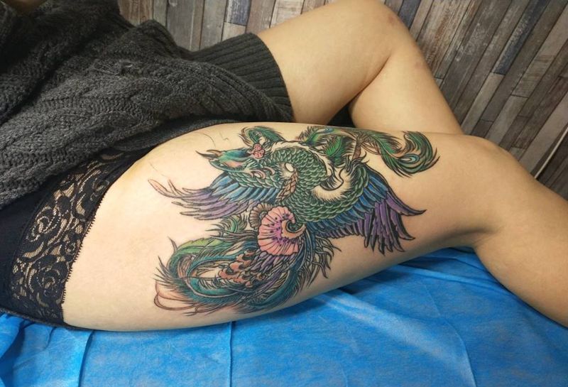 当前位置: 首页 >山西省太原市纹身店-太原翼龙刺青工作室纹身图案>凤凰未完成纹身图片_腿部传统动物鬼神成品手稿纹身图案