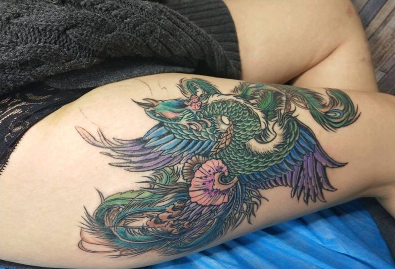 当前位置: 首页 >山西省太原市纹身店-太原翼龙刺青工作室纹身图案>凤凰未完成纹身图片_腿部传统动物鬼神成品手稿纹身图案