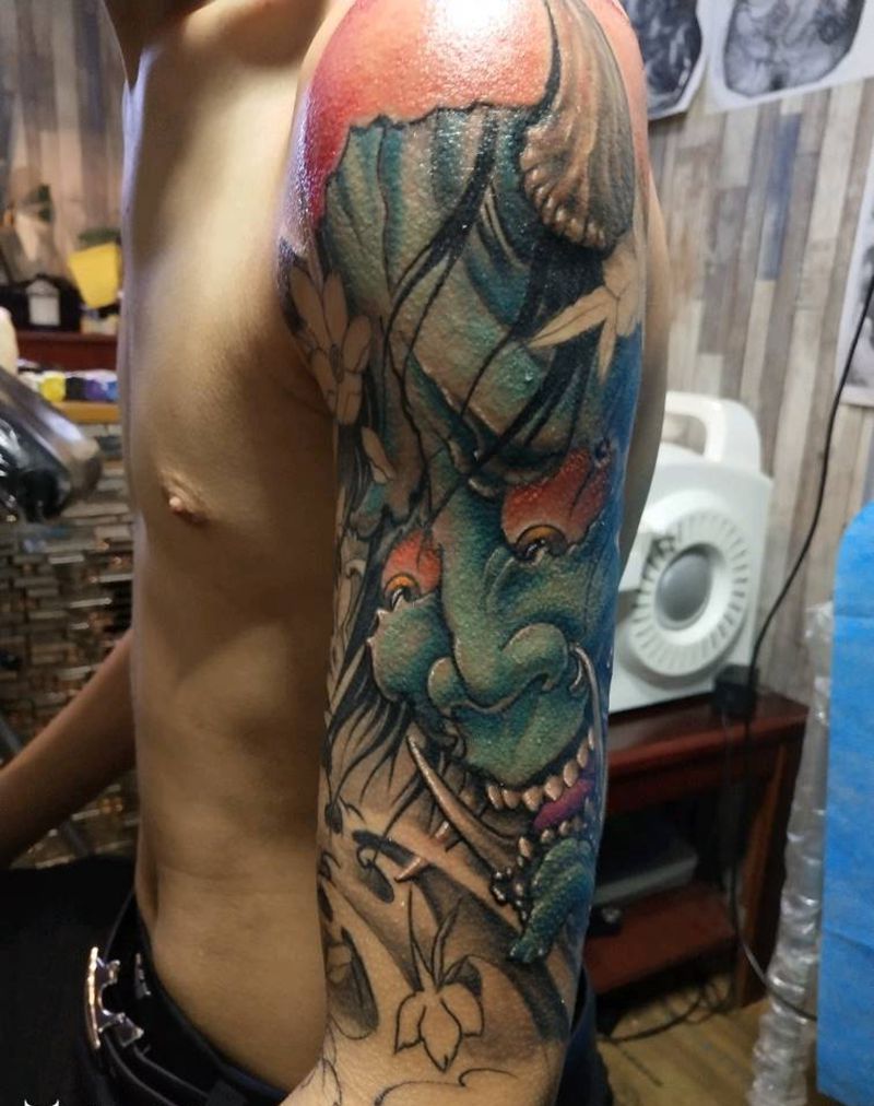 当前位置: 首页 >山西省太原市纹身店-太原翼龙刺青工作室纹身图案>班若妖姬花臂纹身图片_手臂传统人物鬼神成品手稿插画纹身图案