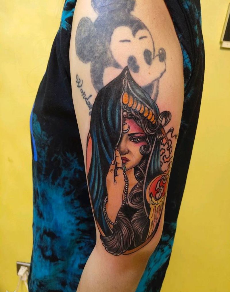 欧美新传统美女纹身图片_手臂新传统New School遮盖纹身图案