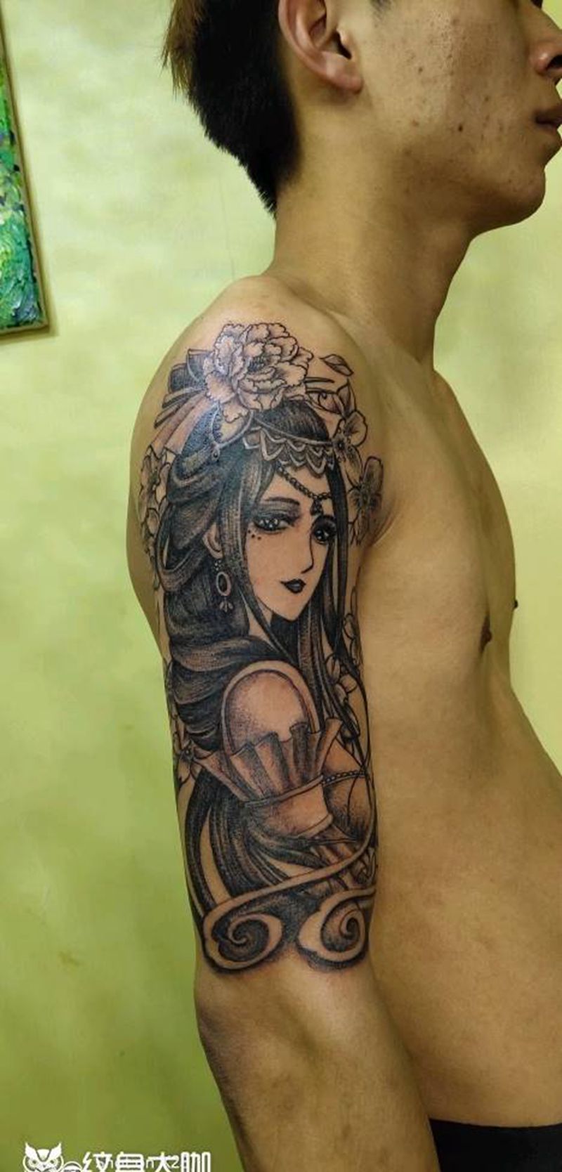 当前位置: 首页 >山西省太原市纹身店-太原翼龙刺青工作室纹身图案>古典美女纹身图片_手臂肩部点刺新传统纹身图案
