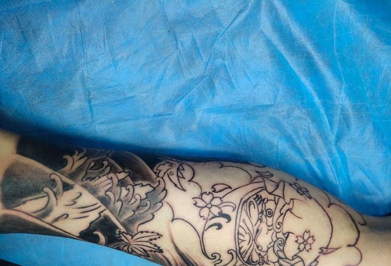当前位置: 首页 >山西省太原市纹身店-太原翼龙刺青工作室纹身图案>老传统包小腿纹身图片_腿部老传统纹身图案