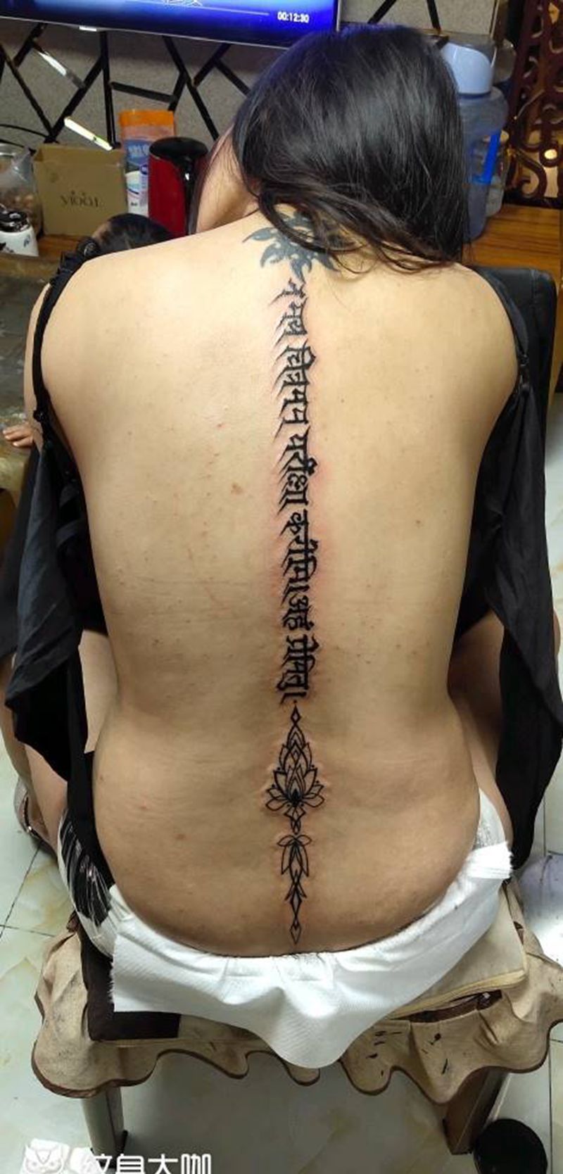当前位置: 首页 >山西省太原市纹身店-太原翼龙刺青工作室纹身图案>梵文脊椎纹身纹身图片_背部图腾几何纹身图案