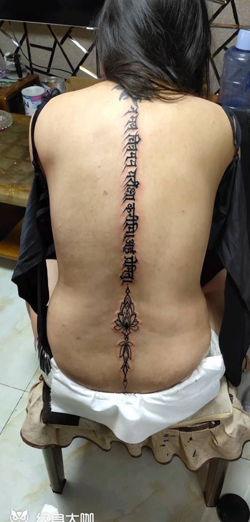 当前位置: 首页 >山西省太原市纹身店-太原翼龙刺青工作室纹身图案>梵文脊椎纹身纹身图片_背部图腾几何纹身图案