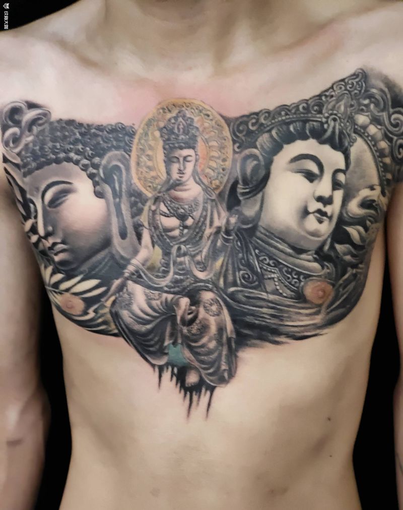 三面佛纹身图片_胸部新传统纹身图案