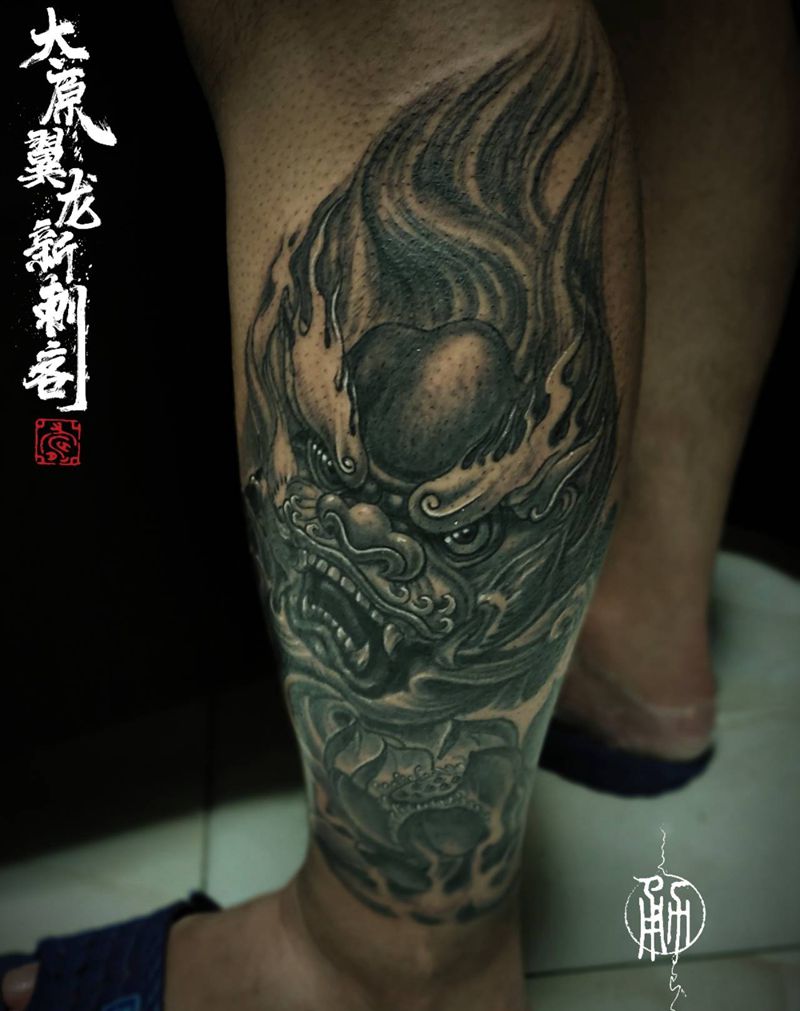 当前位置: 首页 >山西省太原市纹身店-太原翼龙刺青工作室纹身图案>唐狮纹身图片_腿部新传统纹身图案