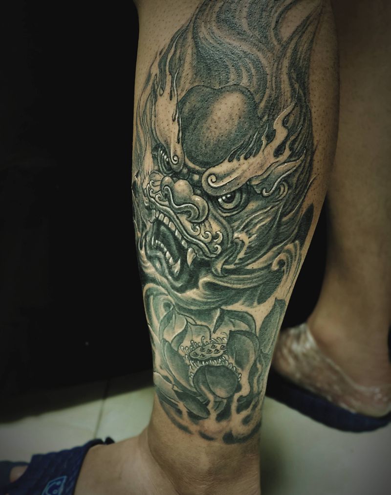 当前位置: 首页 >山西省太原市纹身店-太原翼龙刺青工作室纹身图案>唐狮纹身图片_腿部新传统纹身图案