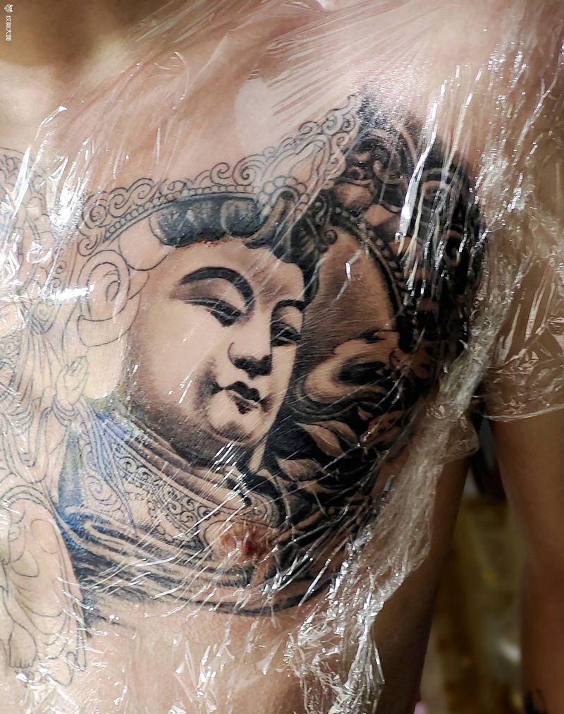三面佛纹身图片_胸部新传统纹身图案