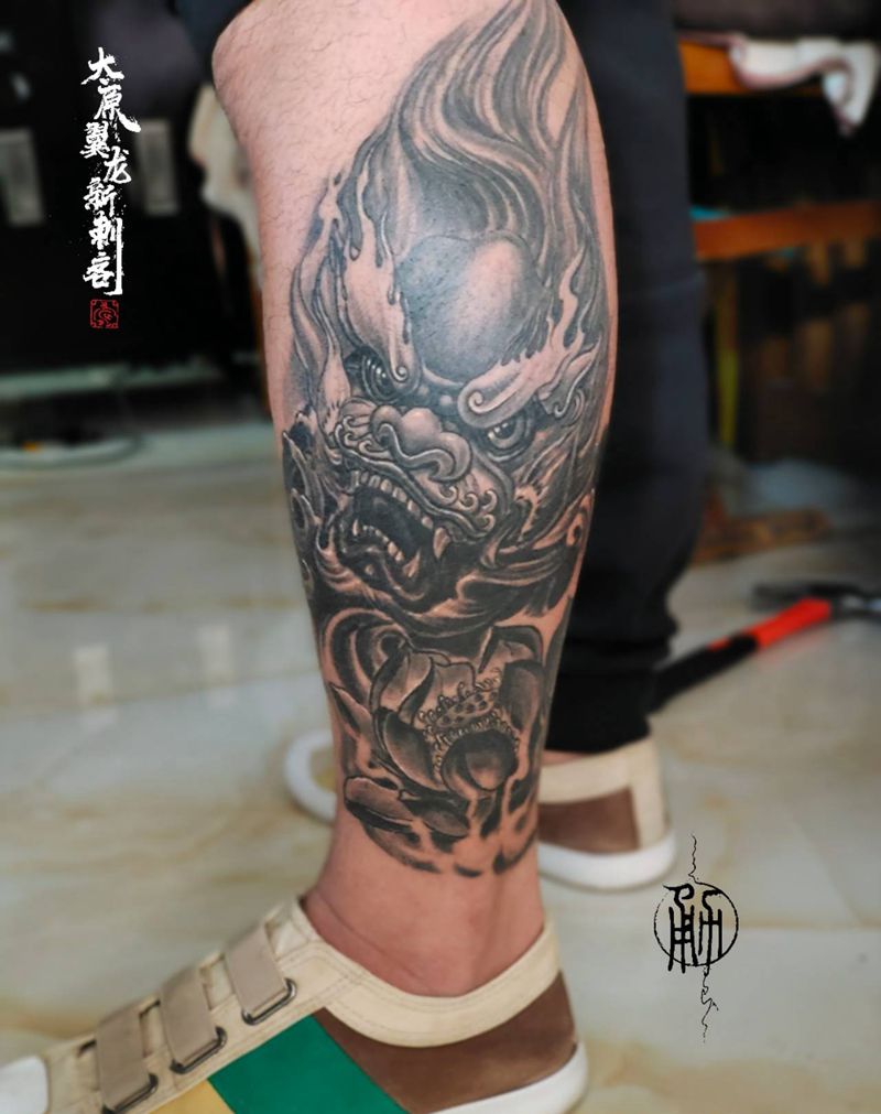 当前位置: 首页 >山西省太原市纹身店-太原翼龙刺青工作室纹身图案>唐狮纹身图片_腿部新传统纹身图案
