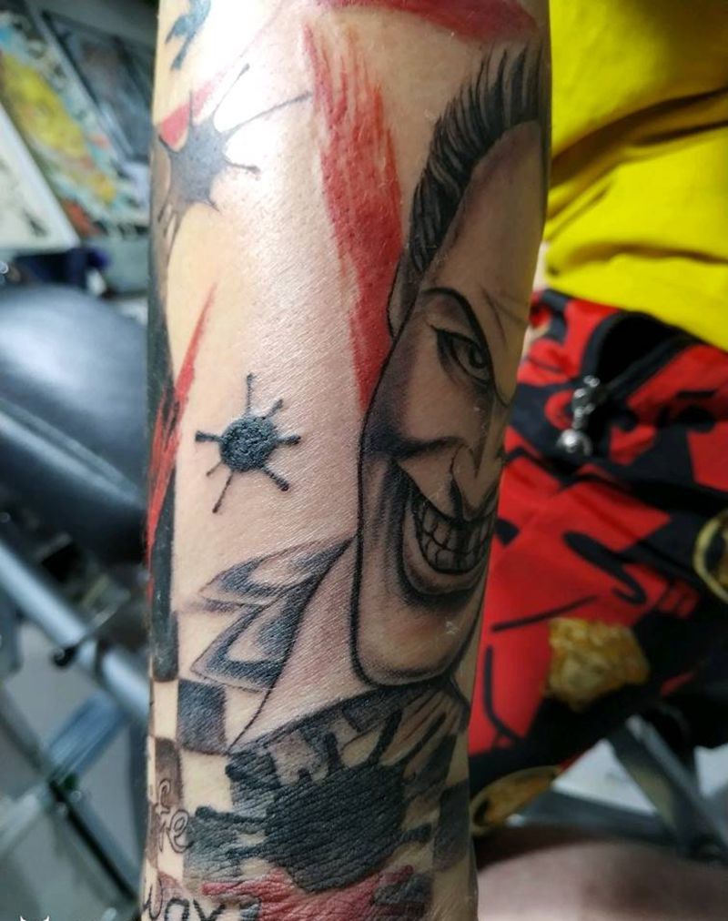 当前位置: 首页 >山西省大同市纹身店-精雕纹刺纹身图案>微笑坏笑面具包小臂纹身图片_手臂欧美写实纹身图案