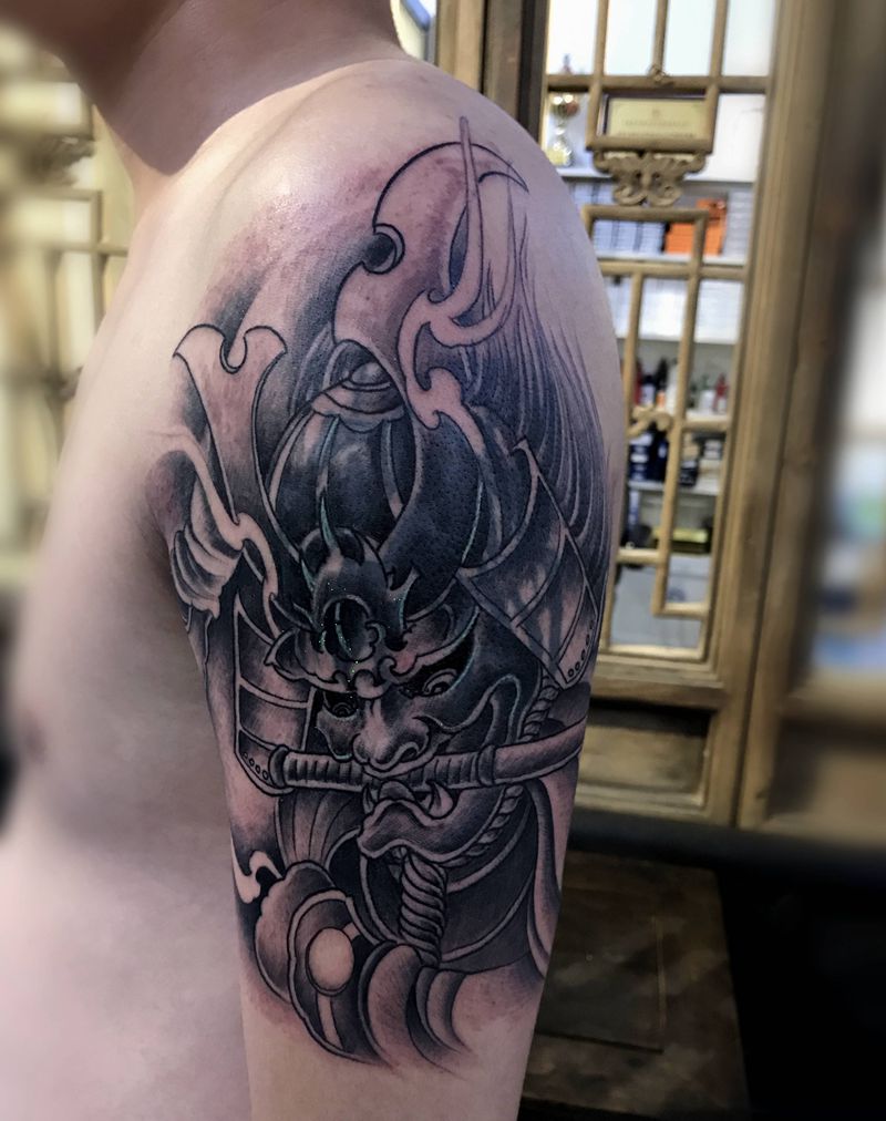鬼武士遮盖图腾纹身图片_手臂新传统纹身图案