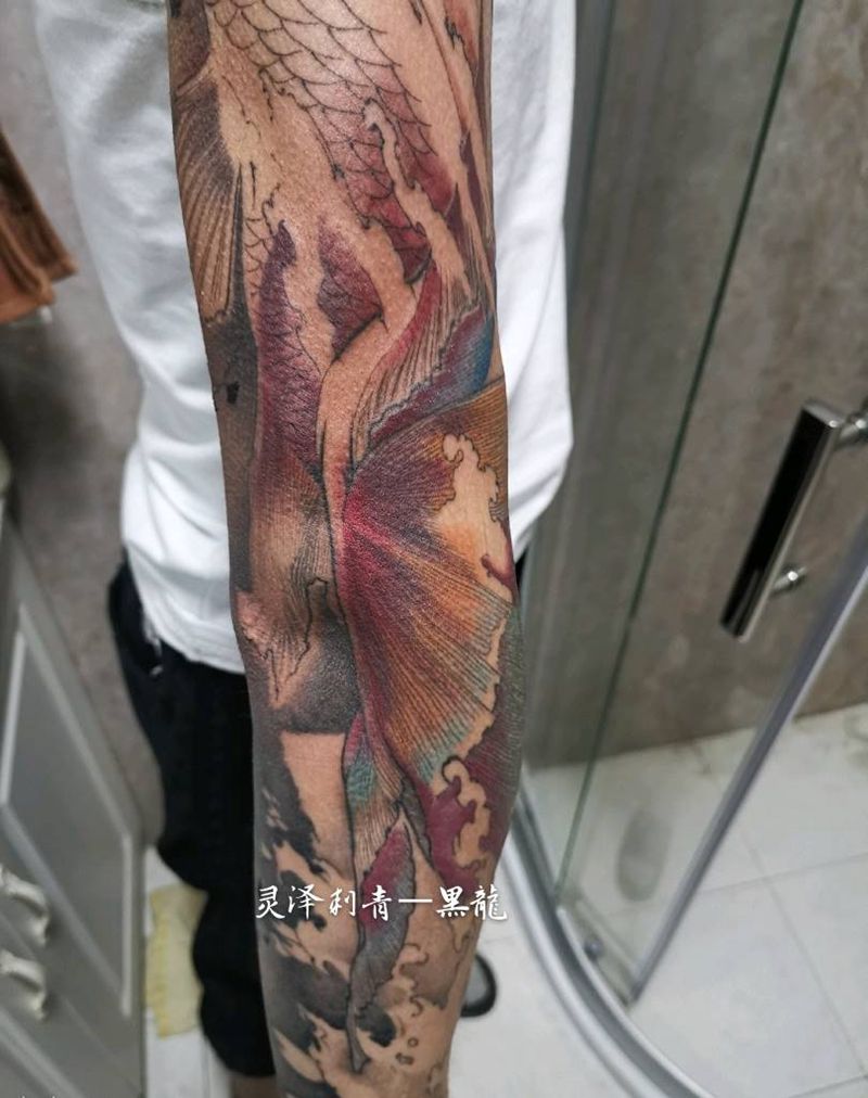 当前位置: 首页 >山西省大同市纹身店-灵泽刺青纹身图案>新传统彩色鲤鱼纹身图片_手臂肩部新传统水墨鱼荷叶纹身图案