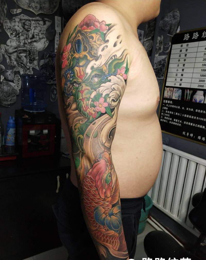 当前位置: 首页 >山西省晋中市纹身店-路路纹艺纹身图案>鲤鱼象神纹身图片_手臂纹身图案