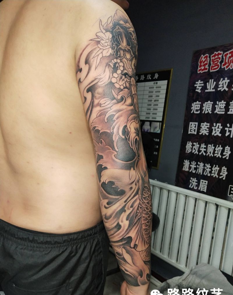 当前位置: 首页 >山西省晋中市纹身店-路路纹艺纹身图案>鲤鱼象神纹身图片_手臂纹身图案