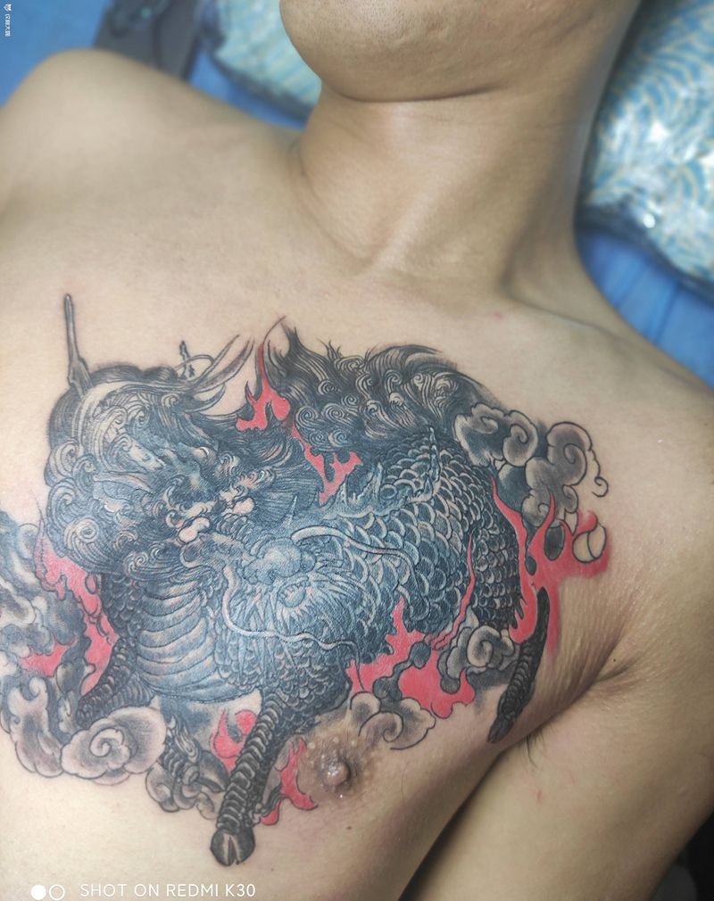 麒麟遮盖鲤鱼纹身图片_胸部纹身图案