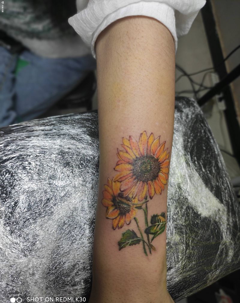 当前位置: 首页 >山西省忻州市纹身店-酷玩刺青纹身图案>向日葵遮盖一个小汉字纹身图片_手臂纹身图案