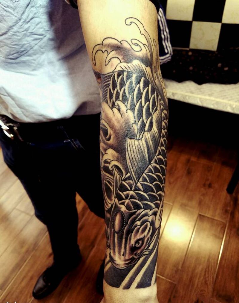 当前位置: 首页 >山西省运城市纹身店-运城-尊炎刺青纹身图案>鲤鱼纹身图片_肩部手臂欧美传统习俗写实动物人物原创成品纹身图案