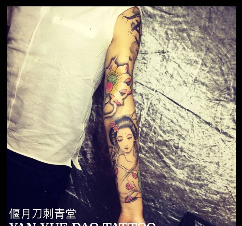 当前位置: 首页 >山西省运城市纹身店-偃月刀刺青工作室纹身图案>水墨艺伎花臂纹身图片_原创成品手臂水墨字艺伎荷花纹身图案