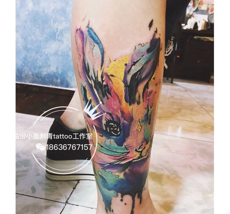 水彩兔子(遮盖)纹身图片_成品手稿腿部清新动物原创纹身图案