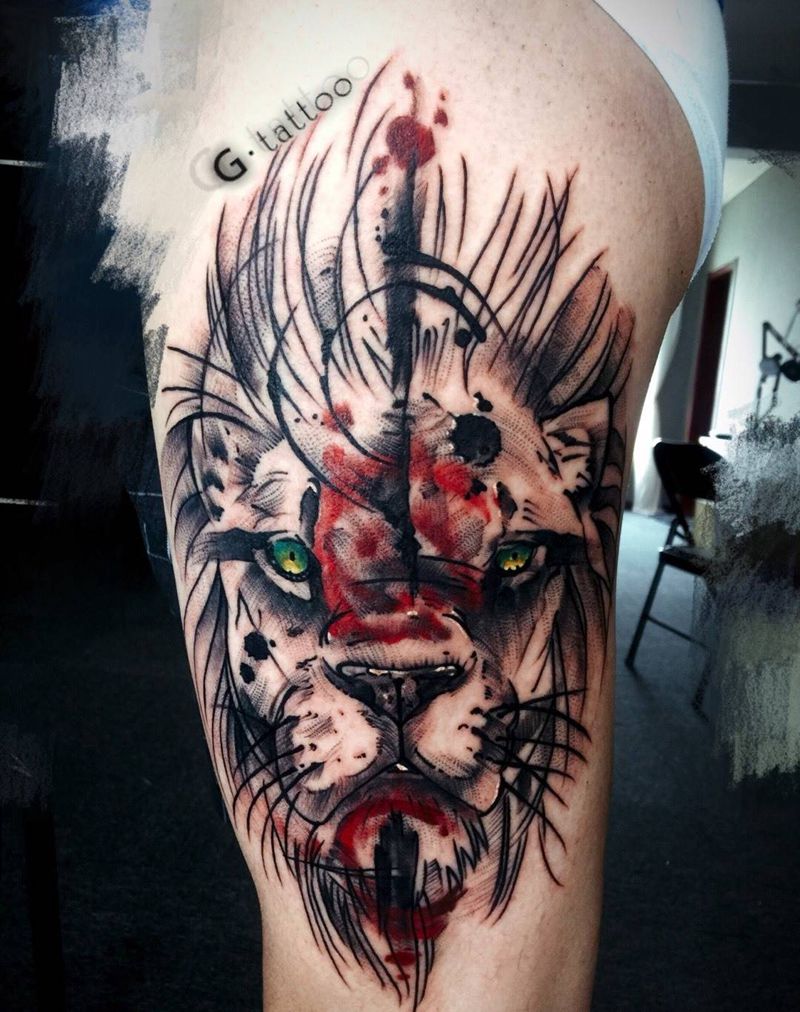 狮子纹身图片_成品手稿腿部欧美写实动物原创情侣纹身图案