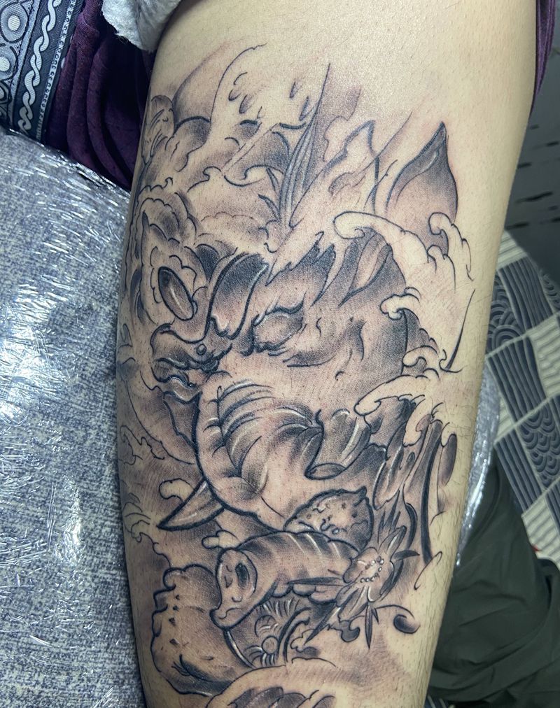 • T网红王老大花腿龙纹身图片_腿部新传统纹身图案