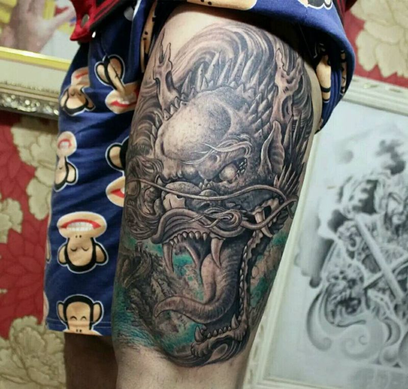 • T网红王老大花腿龙纹身图片_腿部新传统纹身图案