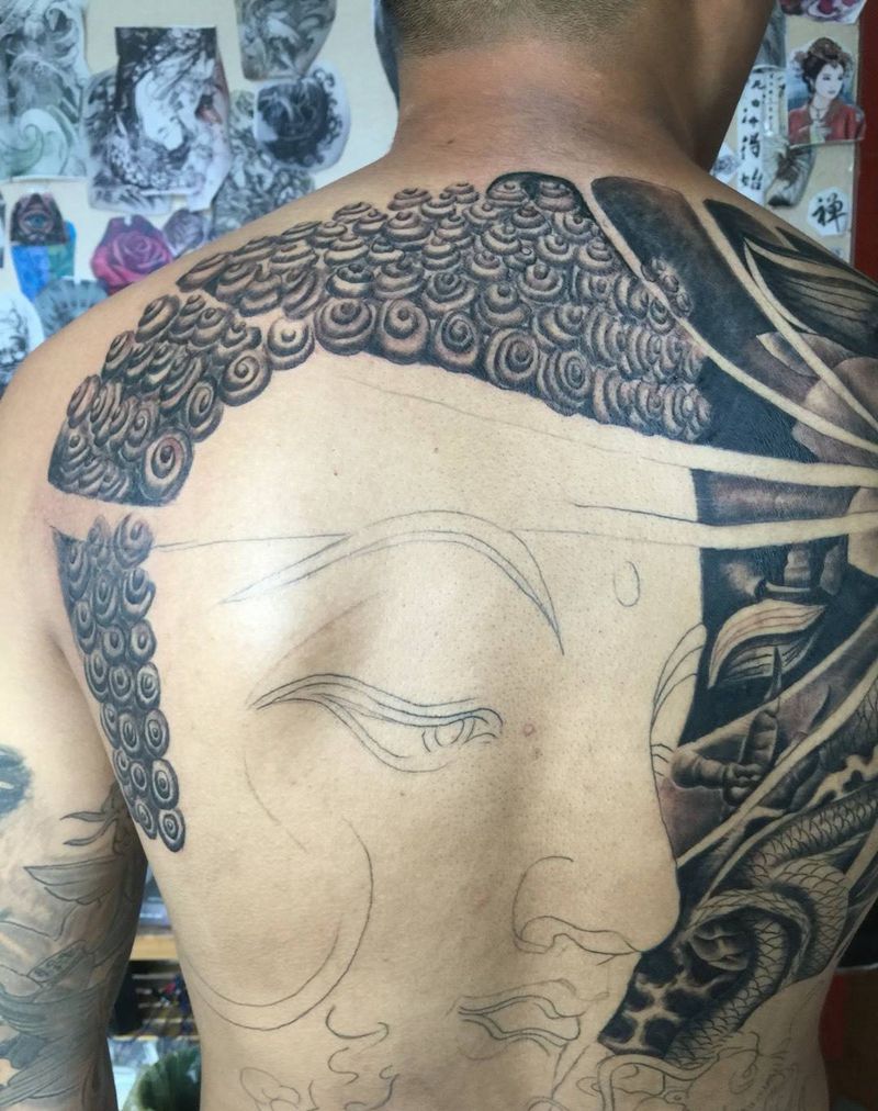当前位置: 首页 >内蒙古呼和浩特市纹身店-蓝玫刺青纹身图案>满背佛未完成纹身图片