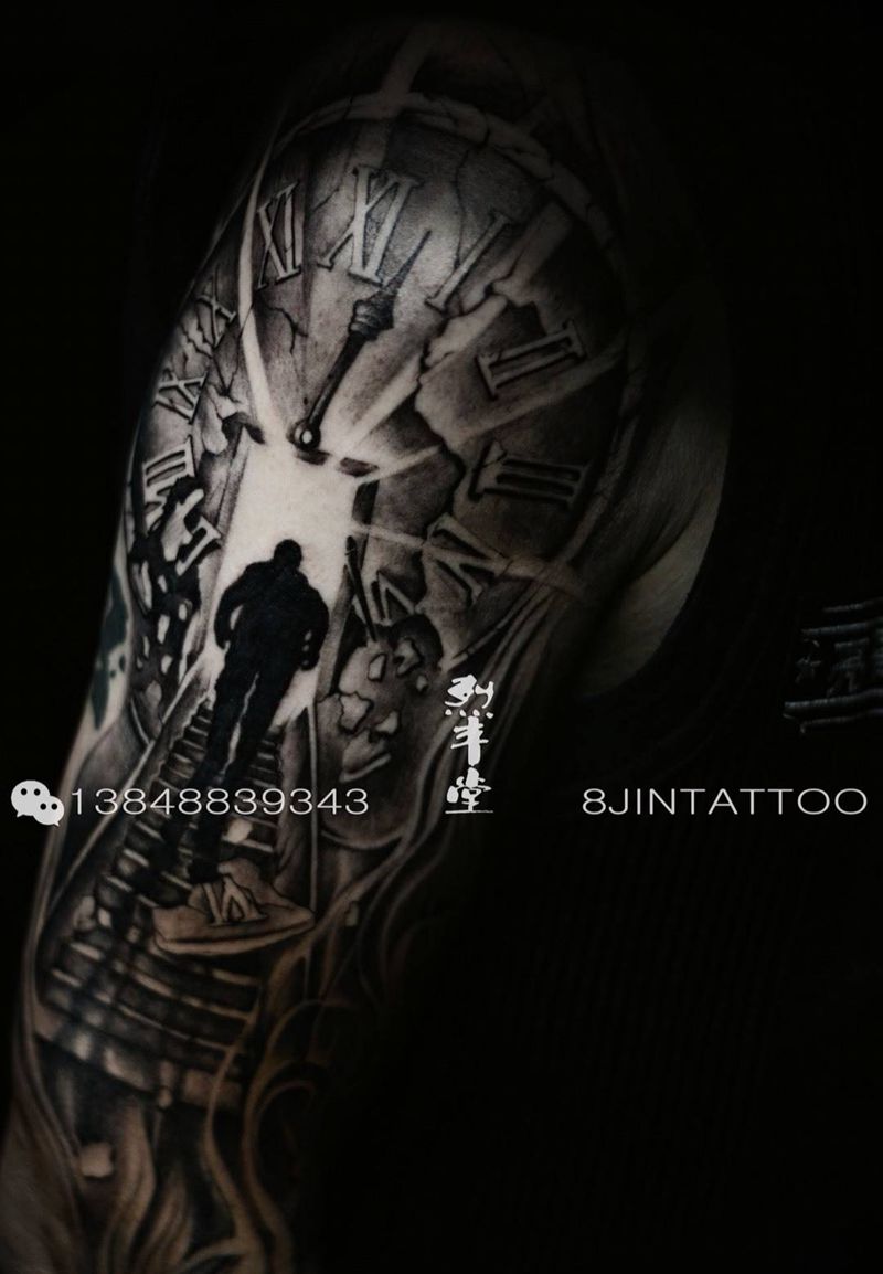 时间都去哪了纹身图片_成品手臂欧美写实原创人物肩部插画纹身图案