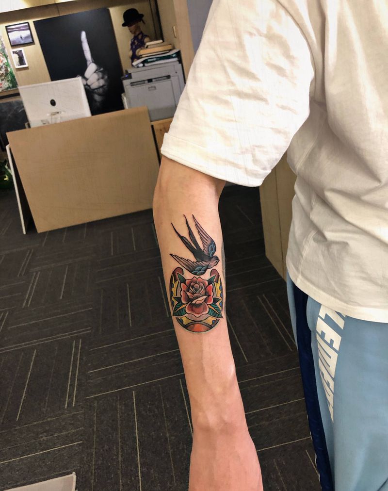 当前位置: 首页 >内蒙古赤峰市纹身店-TDK TATTOO纹身图案>Old schoo马蹄铁 燕子纹身图片_手臂Old School纹身图案