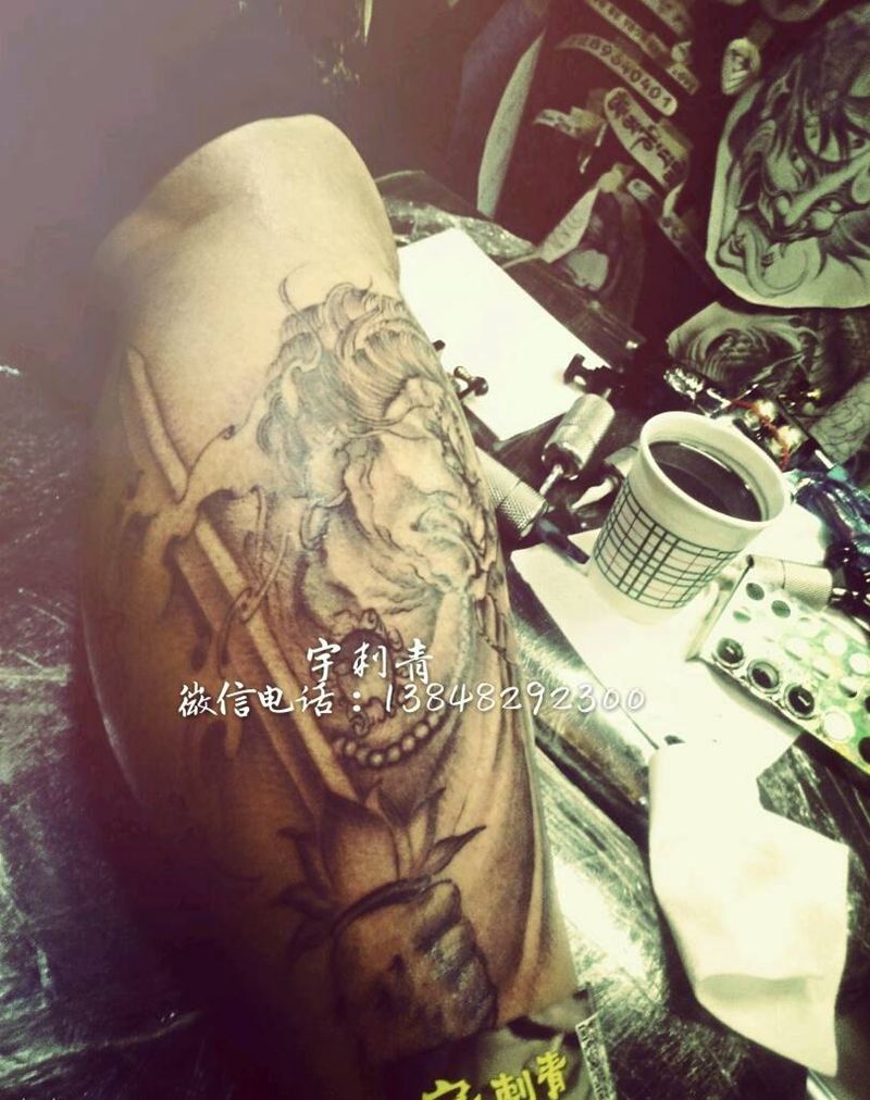 不动尊纹身图片_腿部传统鬼神宗教未完成成品纹身图案