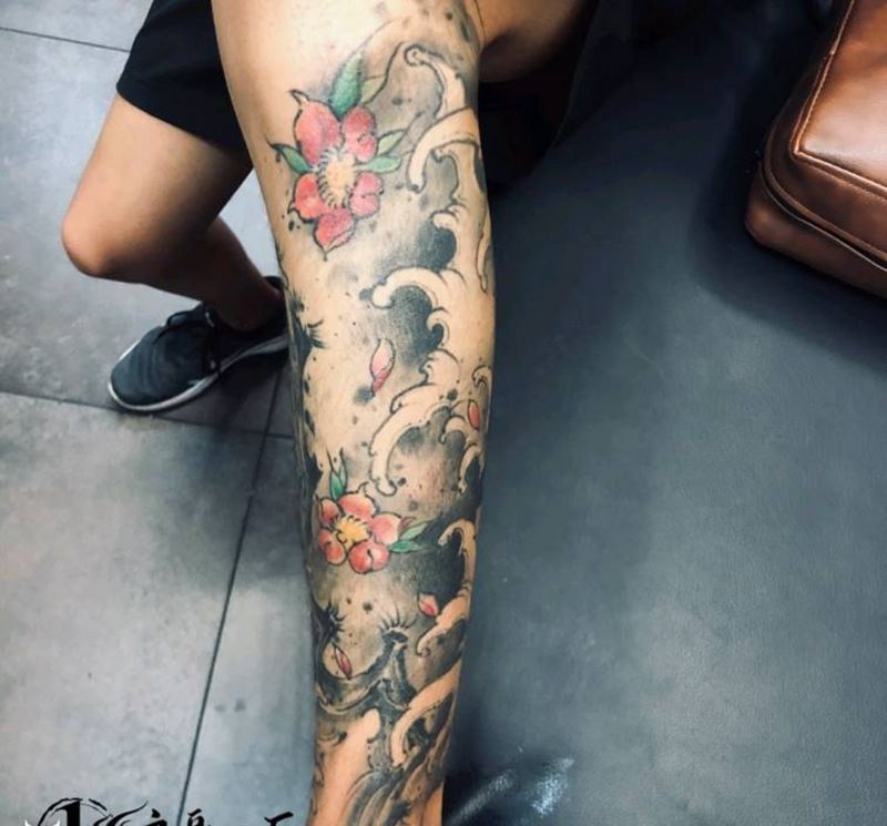 • T网红王老大花腿龙纹身图片_腿部新传统纹身图案