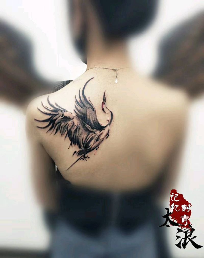 水墨仙鹤纹身图片_肩部背部水墨仙鹤纹身图案