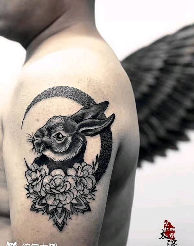 当前位置: 首页 >内蒙古赤峰市纹身店-记忆刺青tattoo纹身图案>花前月下兔纹身图片_手臂点刺纹身图案