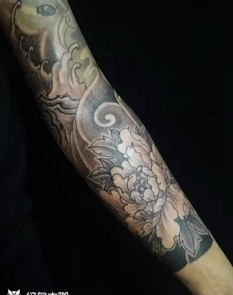 象神牡丹花臂纹身图片_手臂新传统花臂纹身图案
