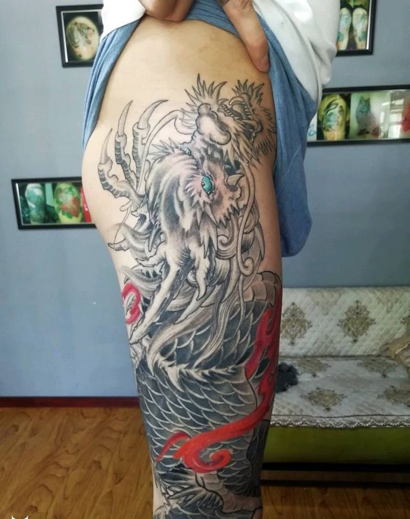 • T网红王老大花腿龙纹身图片_腿部新传统纹身图案