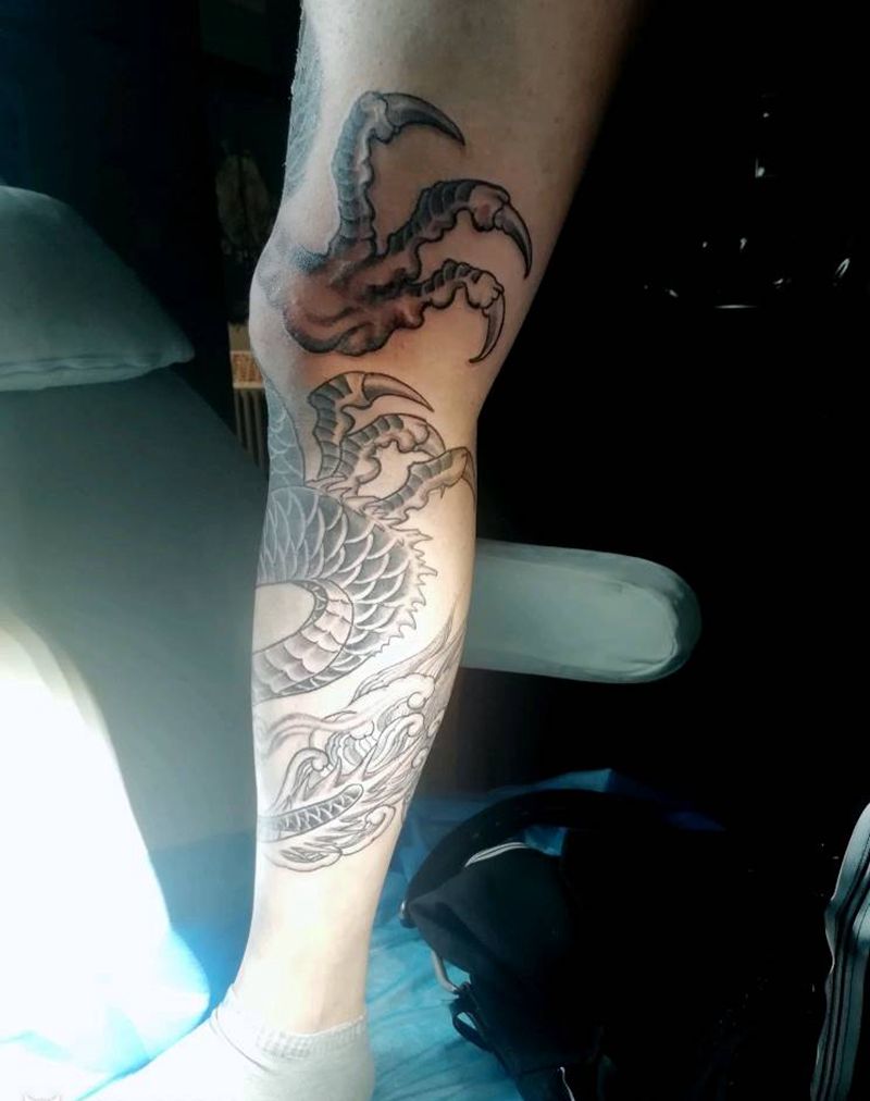 • T网红王老大花腿龙纹身图片_腿部新传统纹身图案