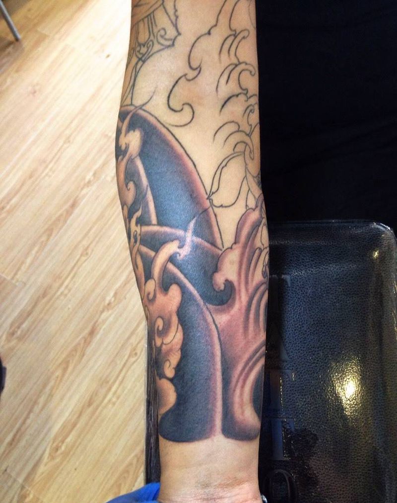 当前位置: 首页 >内蒙古包头市纹身店-包头金甲纹身纹身图案>千手观音花臂半胛进程纹身图片