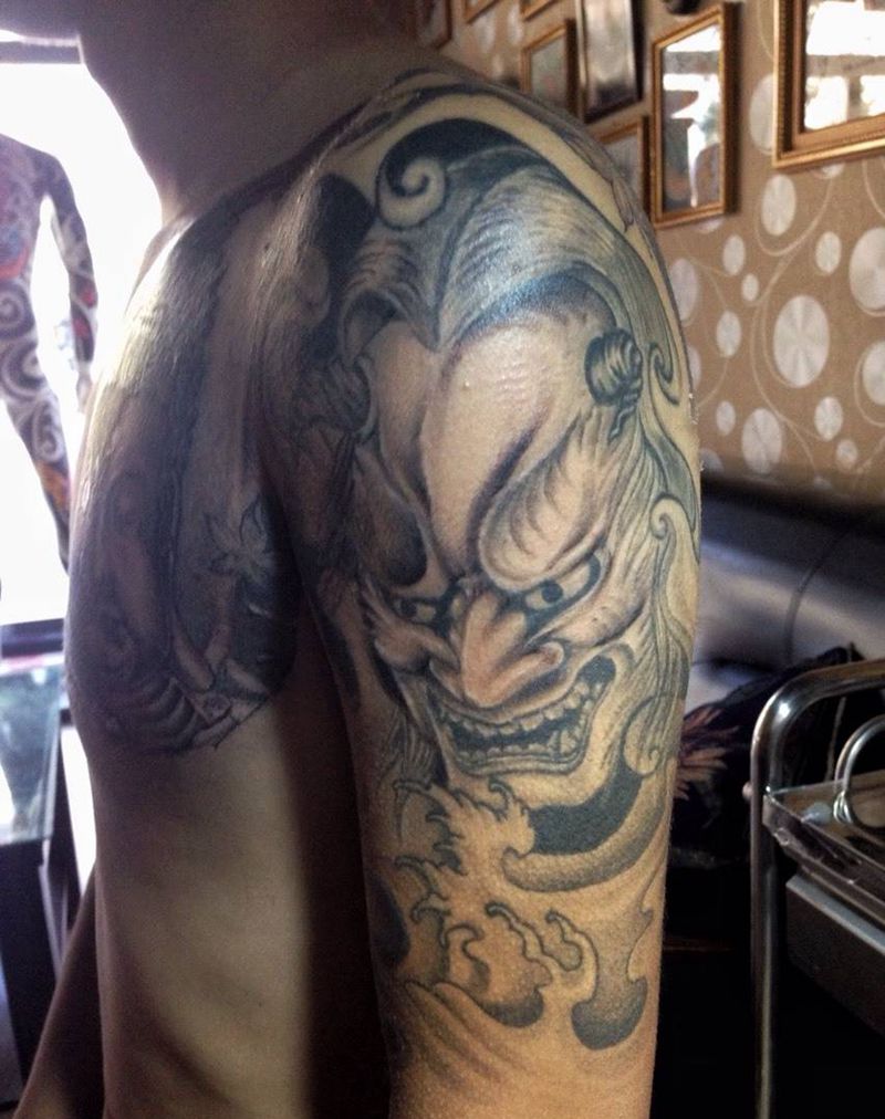 当前位置: 首页 >内蒙古包头市纹身店-包头金甲纹身纹身图案>传统半甲纹身图片_成品肩部胸部手臂传统鬼神宗教半甲纹身图案