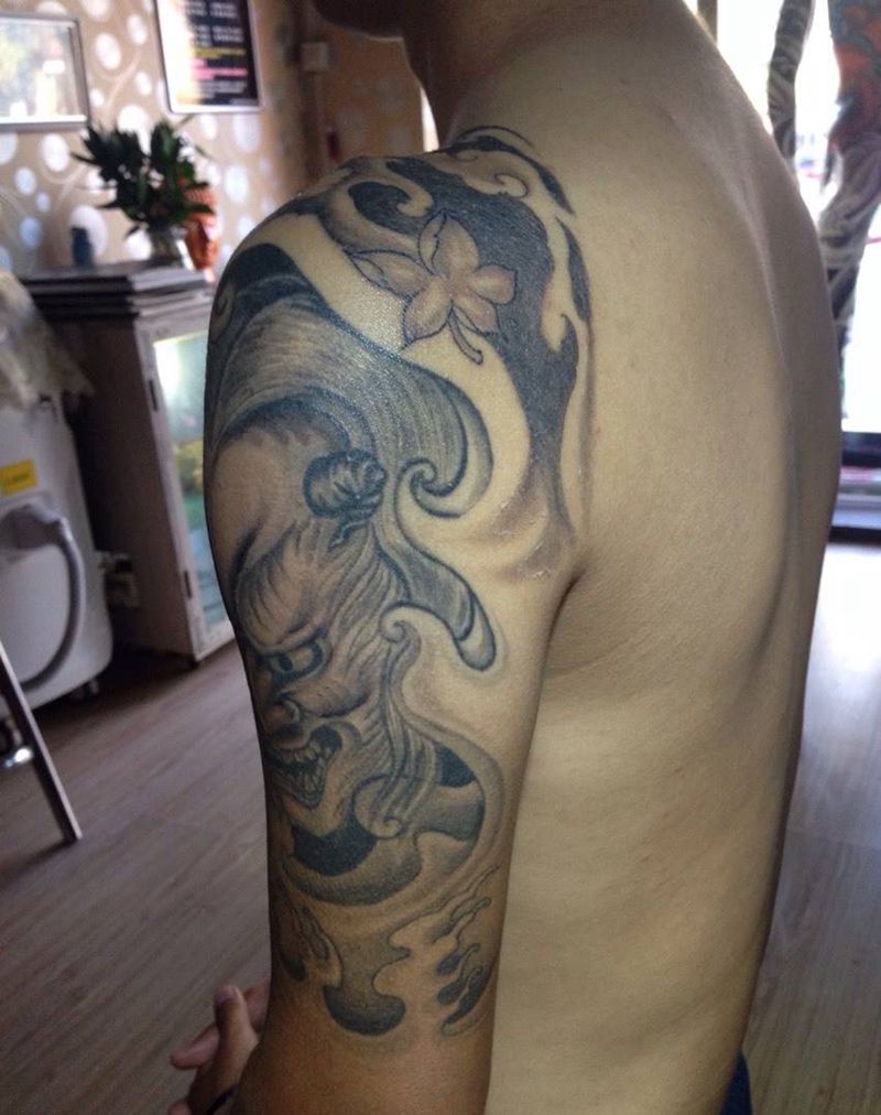 当前位置: 首页 >内蒙古包头市纹身店-包头金甲纹身纹身图案>传统半甲纹身图片_成品肩部胸部手臂传统鬼神宗教半甲纹身图案