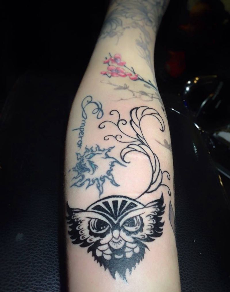 当前位置: 首页 >内蒙古包头市纹身店-包头金甲纹身纹身图案>猫头鹰纹身图片_成品手稿欧美传统写实国画手臂动物字符花臂纹身图案