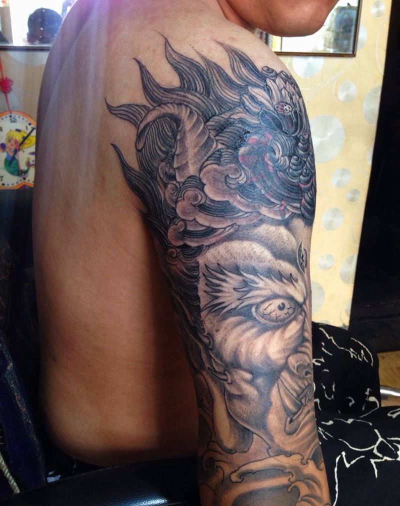 一念之间纹身图片_手稿手臂传统宗教花臂纹身图案