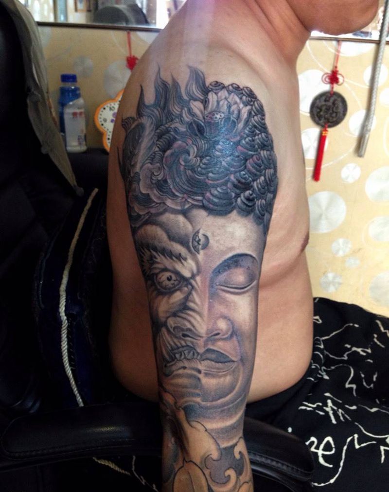 一念之间纹身图片_手稿手臂传统宗教花臂纹身图案