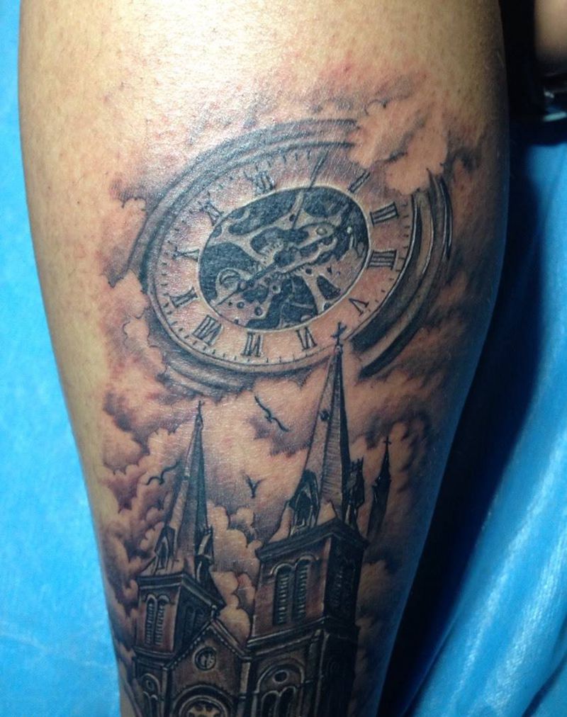 钟楼纹身图片_成品腿部写实欧美静物纹身图案