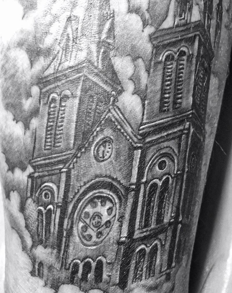 钟楼纹身图片_成品腿部写实欧美静物纹身图案