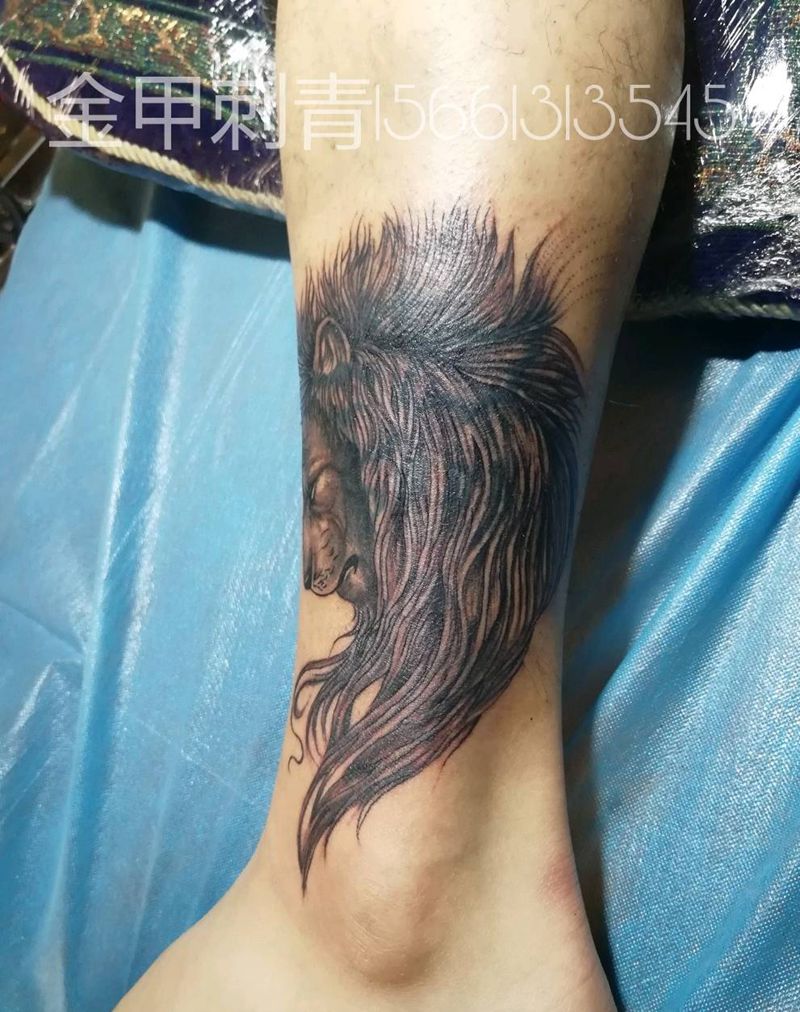 遮盖狮子纹身图片_腿部脚部欧美写实动物成品纹身图案
