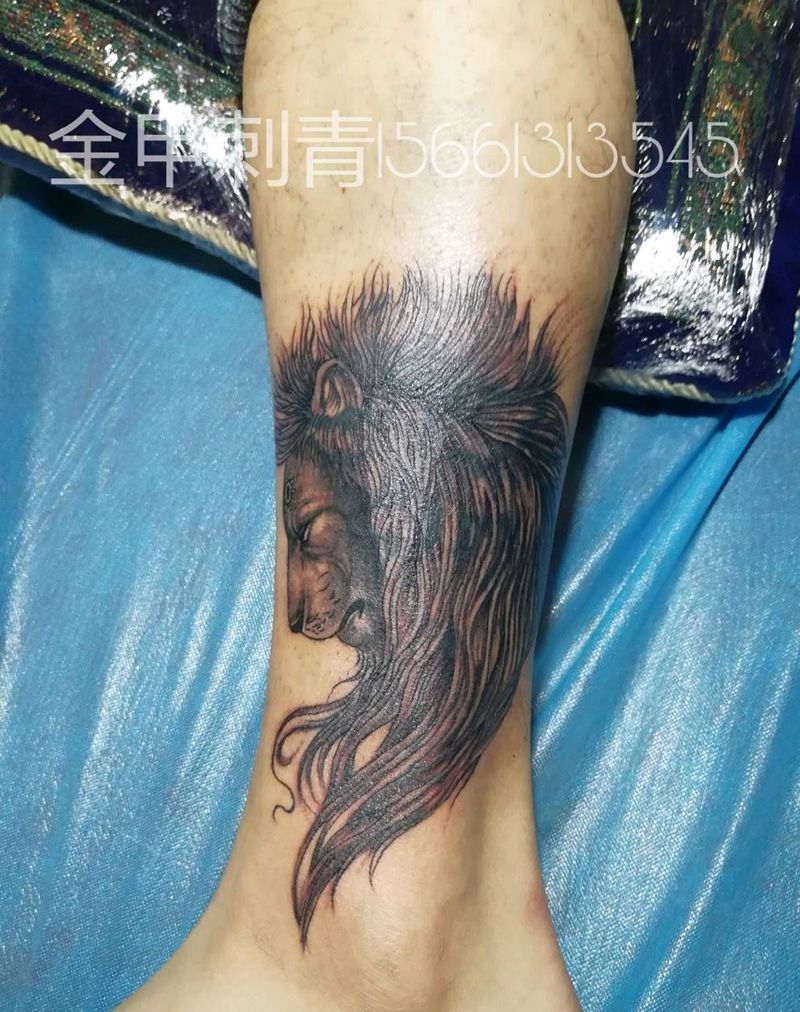 遮盖狮子纹身图片_腿部脚部欧美写实动物成品纹身图案