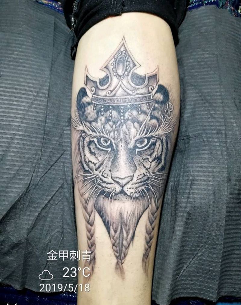 维京虎头纹身图片_腿部欧美写实纹身图案