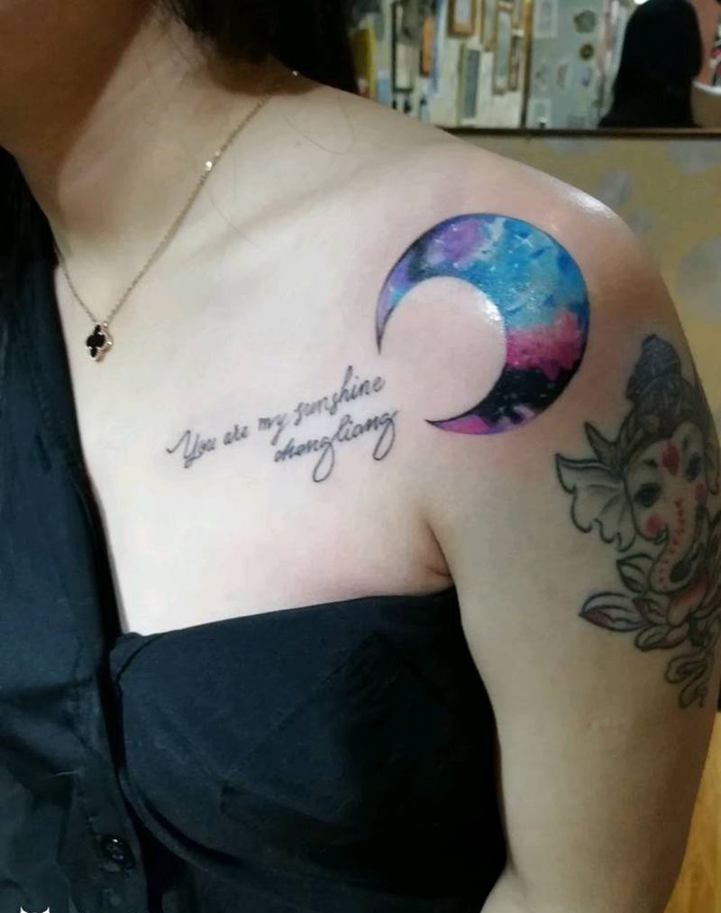 彩色月亮纹身图片_胸部肩部水彩纹身图案