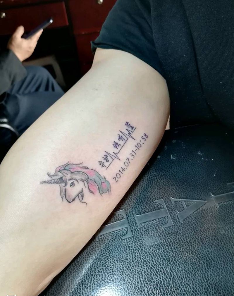 英文独角兽纹身图片_手臂花体字水彩纹身图案