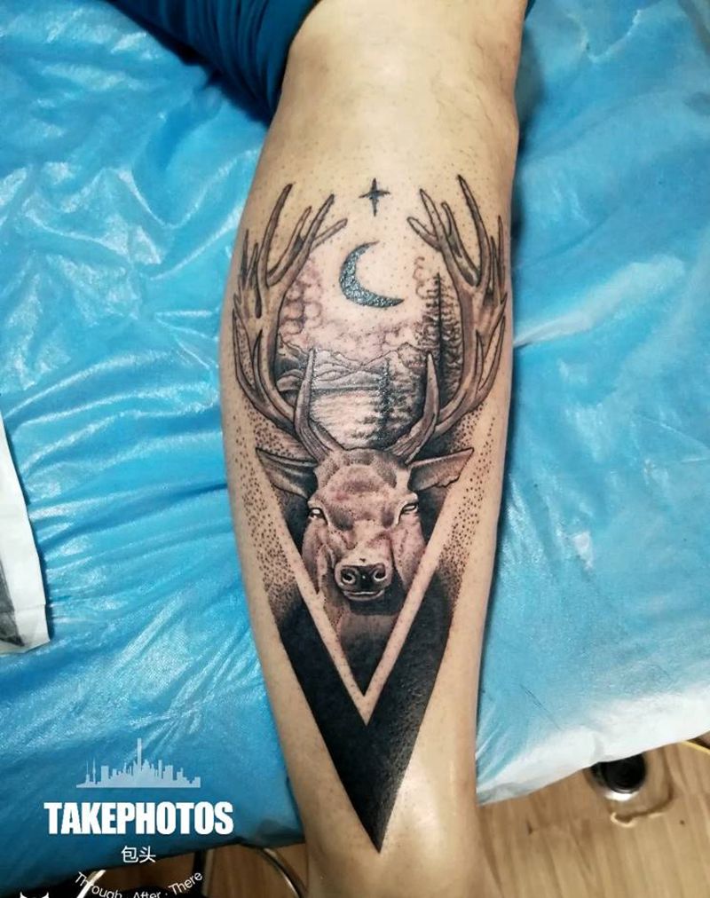 鹿纹身图片_腿部点刺纹身图案